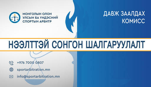 Допингтой холбоотой хэрэг, маргааныг хянан шийдвэрлэх Монголын Олон улсын ба үндэсний Спортын арбитрын дэргэдэх допингийн Давж заалдах комиссын гишүүн (спорт)-ийг сонгох нээлттэй сонгон шалгаруулалт зарлагдлаа.