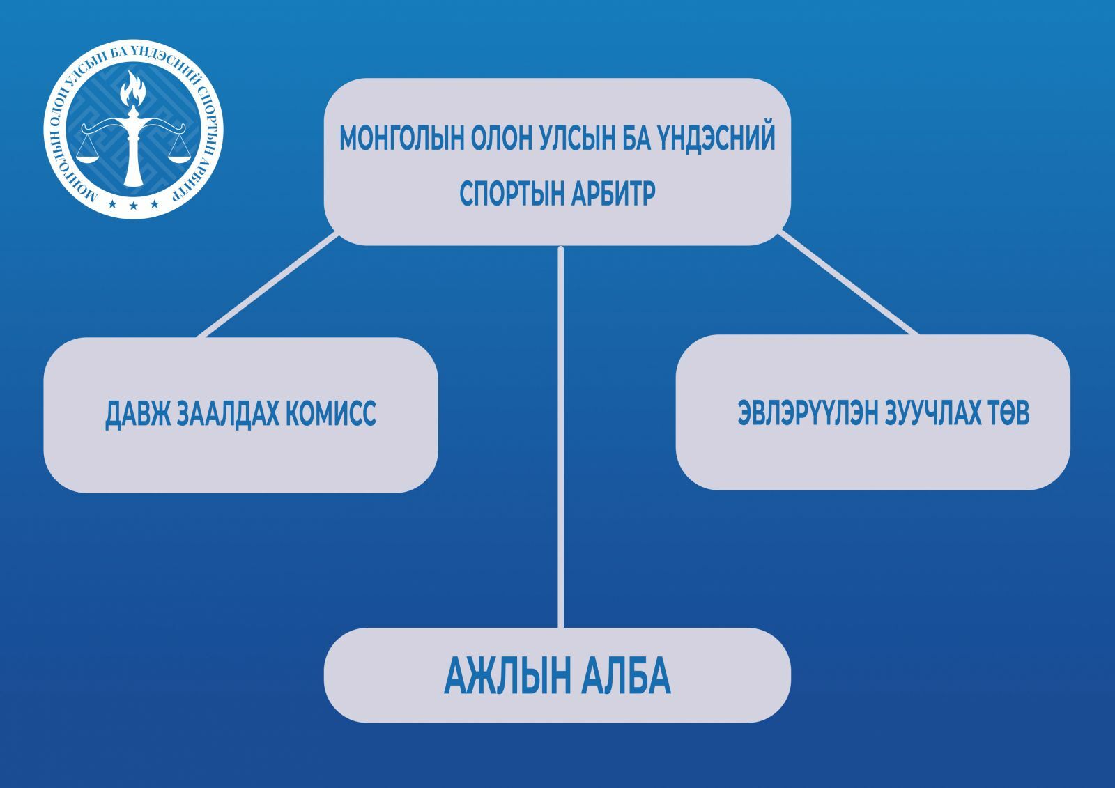 Монголын Олон улсын ба үндэсний Спортын арбитр нь допингийн Давж заалдах комисс, Эвлэрүүлэн зуучлах төв, Ажлын алба гэсэн бүтэцтэйгээр спортын арбитрч 32, гадаад улсын арбитрч 2, допингийн Давж заалдах комисс 7, Эвлэрүүлэн зуучлагч 3 хүн нийт 47 хүний бүрэлдэхүүнтэй байнгын үйл ажиллагаа явуулж байна.